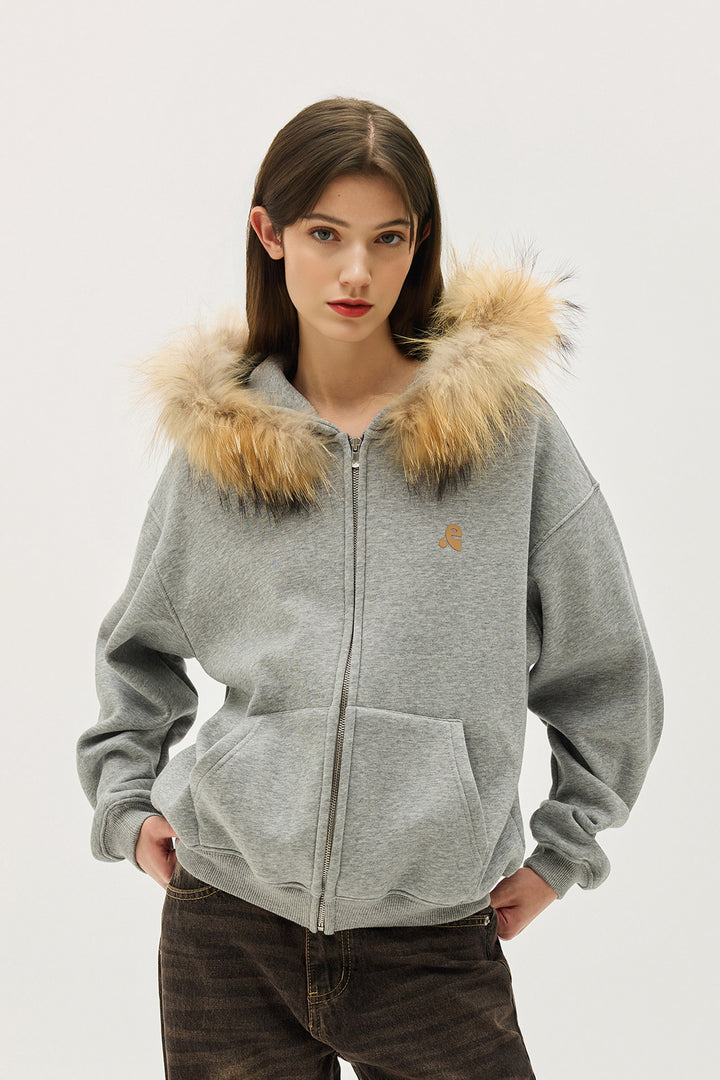 This hoodie combines the ease of a classic zip-up with the added warmth of a fleece-lined interior, making it a reliable layer for colder days. The faux fur trim brings warmth and presence to the hood, giving the piece a distinctive, slightly vintage feel without looking heavy or overdone.
