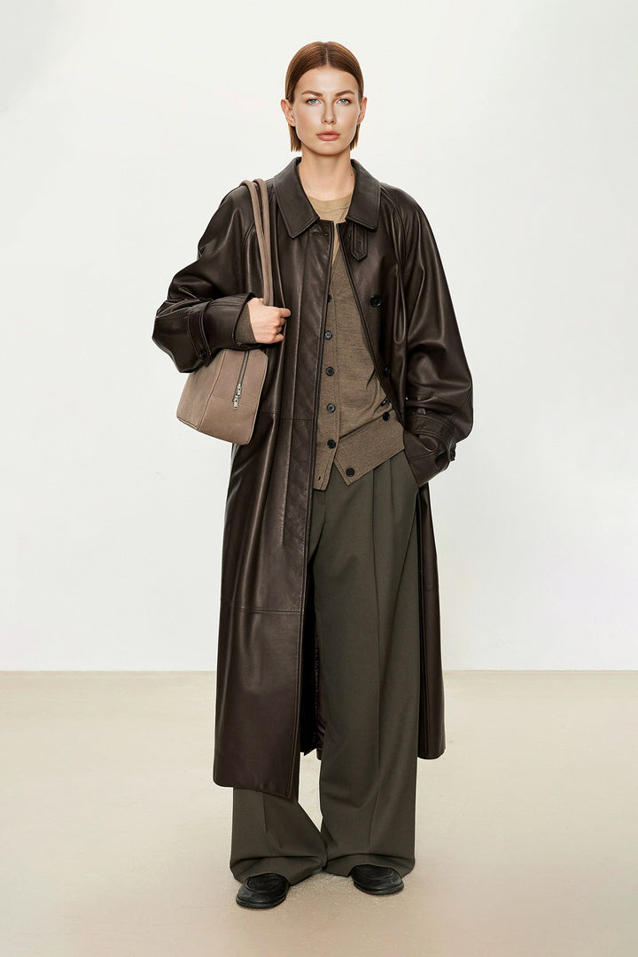 The Lambskin Leather Long Belted Trench Coat elevates the classic leather coat with a sweeping silhouette and clean, minimalist lines. Crafted from vegetable-tanned lambskin with a relaxed drape and a single-breasted front, it highlights timeless structure with subtle confidence. Perfect for everyday city movement, it brings an effortless, modern presence to any wardrobe.