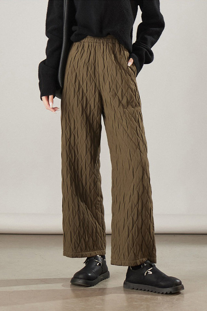 The Quilted Wide-Leg Pull-On Insulated Pants bring gentle warmth into everyday dressing with their sculpted diamond quilting and relaxed silhouette. The softly padded, three-layer construction creates a cocoon-like feel, keeping warmth close while allowing the fabric to fall naturally and fluidly along the leg. With a wide-leg cut and elastic waistband, they offer an easy, flattering fit that feels both comfortable and refined. Perfect for calm city days or quiet outings, they pair effortlessly with knitwear and flats for a composed, modern look.