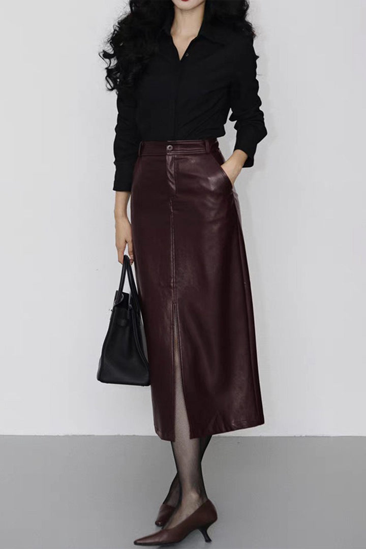 Tailored Lambskin Leather Midi Skirt with Front Slit