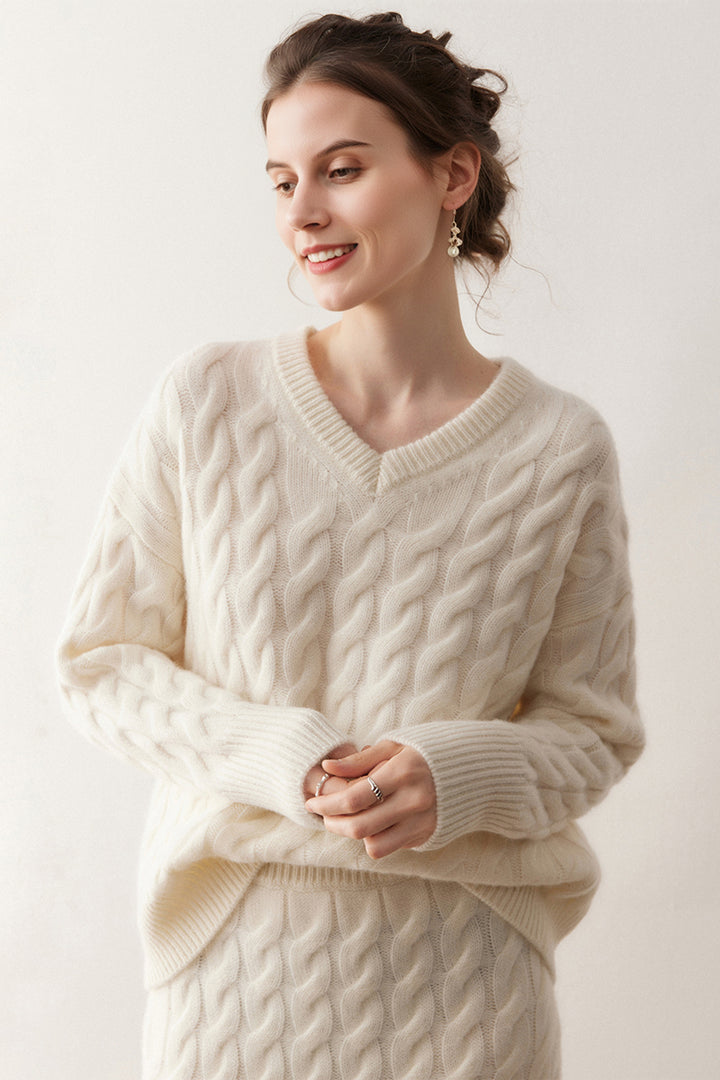 Ultrasoft Cashmere-Merino Cable Knit V-Neck Sweater