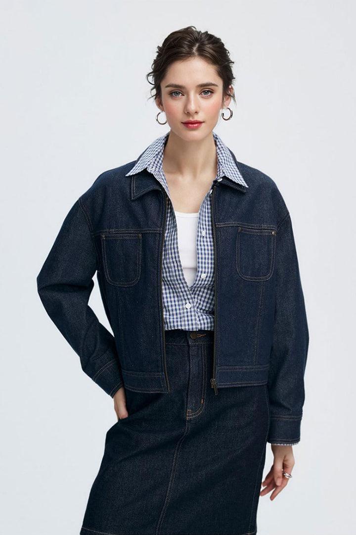 Vintage Cropped Zip-Up Denim Boxy Jacket with Pockets